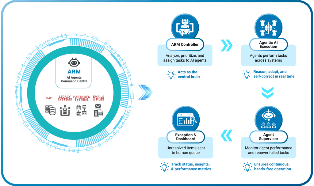 ARM enables seamless integration of Agentic AI into your workflows. These agents can operate across servers, browsers, and applications to automate repetitive tasks. By leveraging ARM, organizations can reduce manual effort, improve accuracy, and accelerate operations with minimal coding.