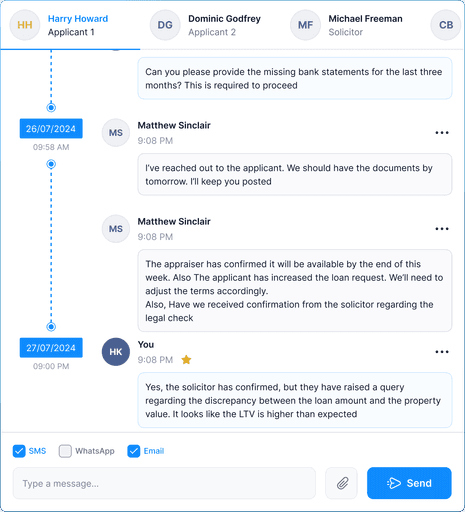 Send updates via WhatsApp, Email, & SMS directly from the interface